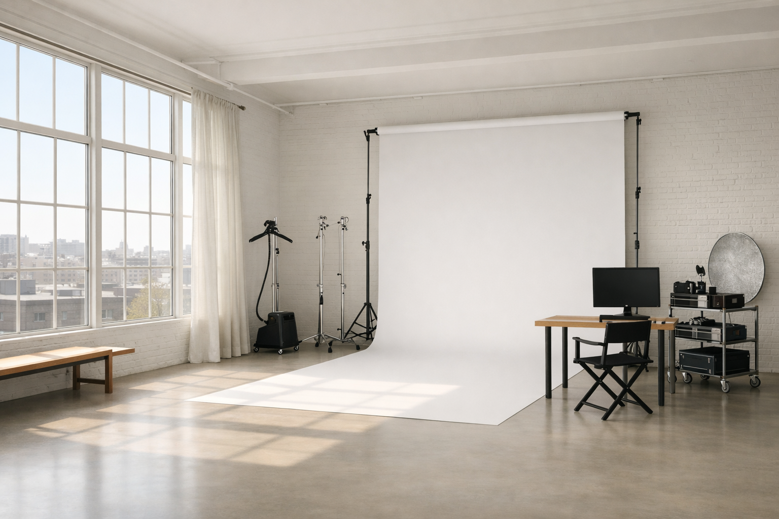 Светлый лофт с северными окнами, белыми стенами и зоной под клиентский монитор.